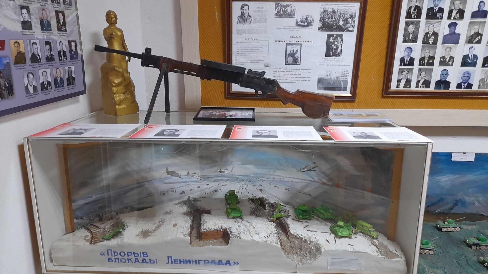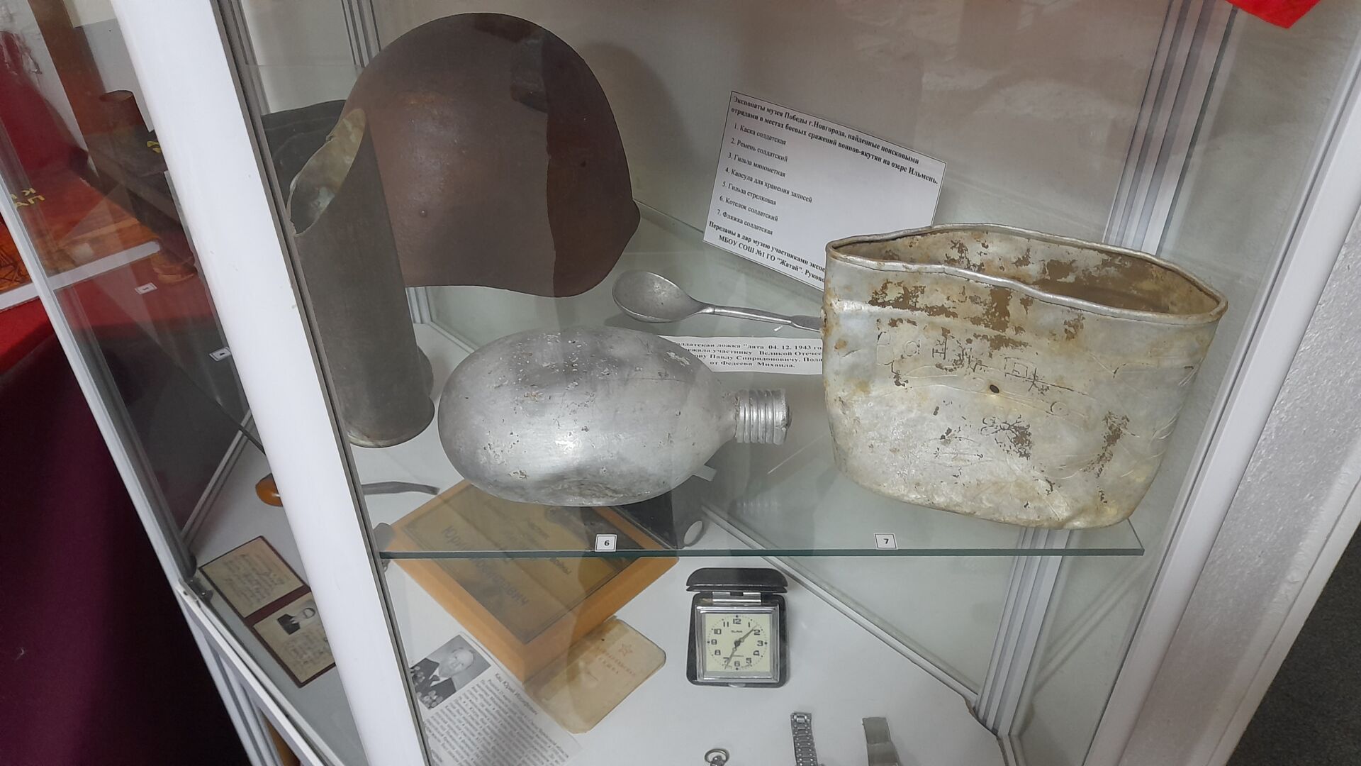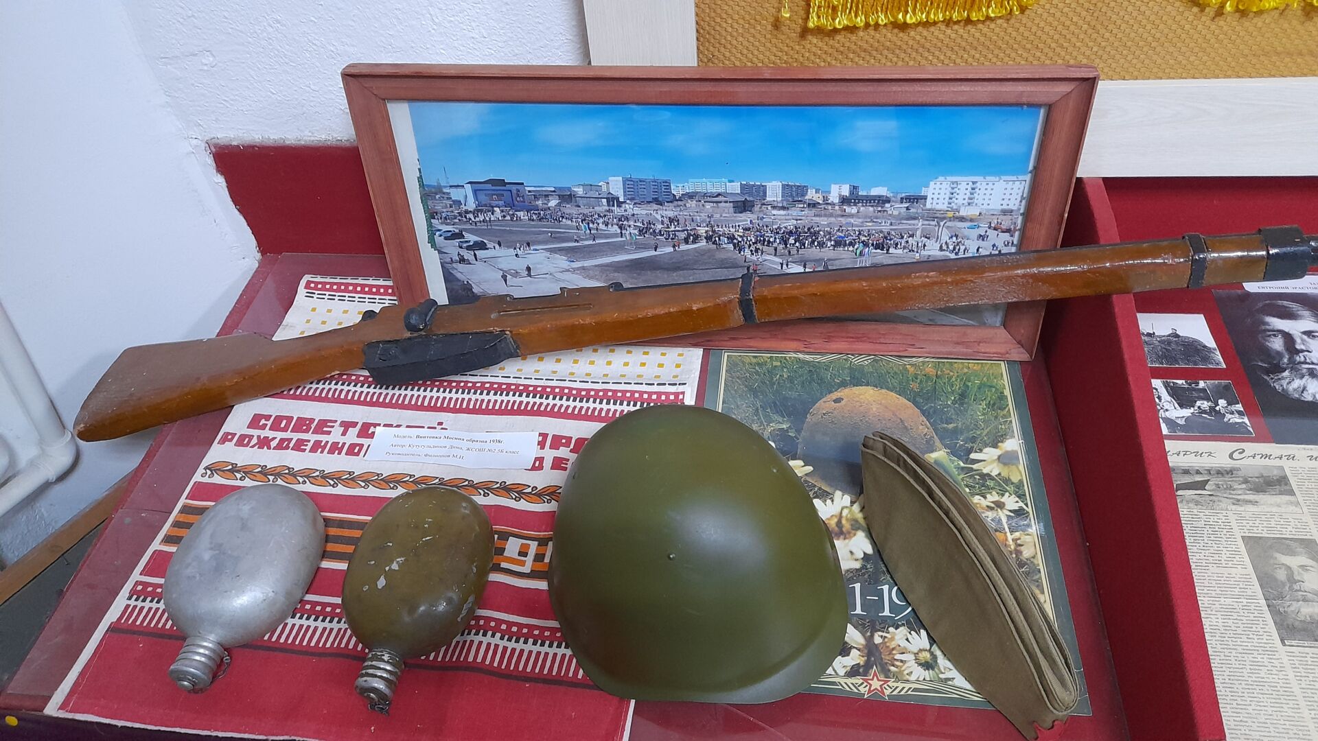 На выставке представлены фотоматериалы, книги, личные вещи участников войны, модели советского оружия времен ВОВ и многое другое.