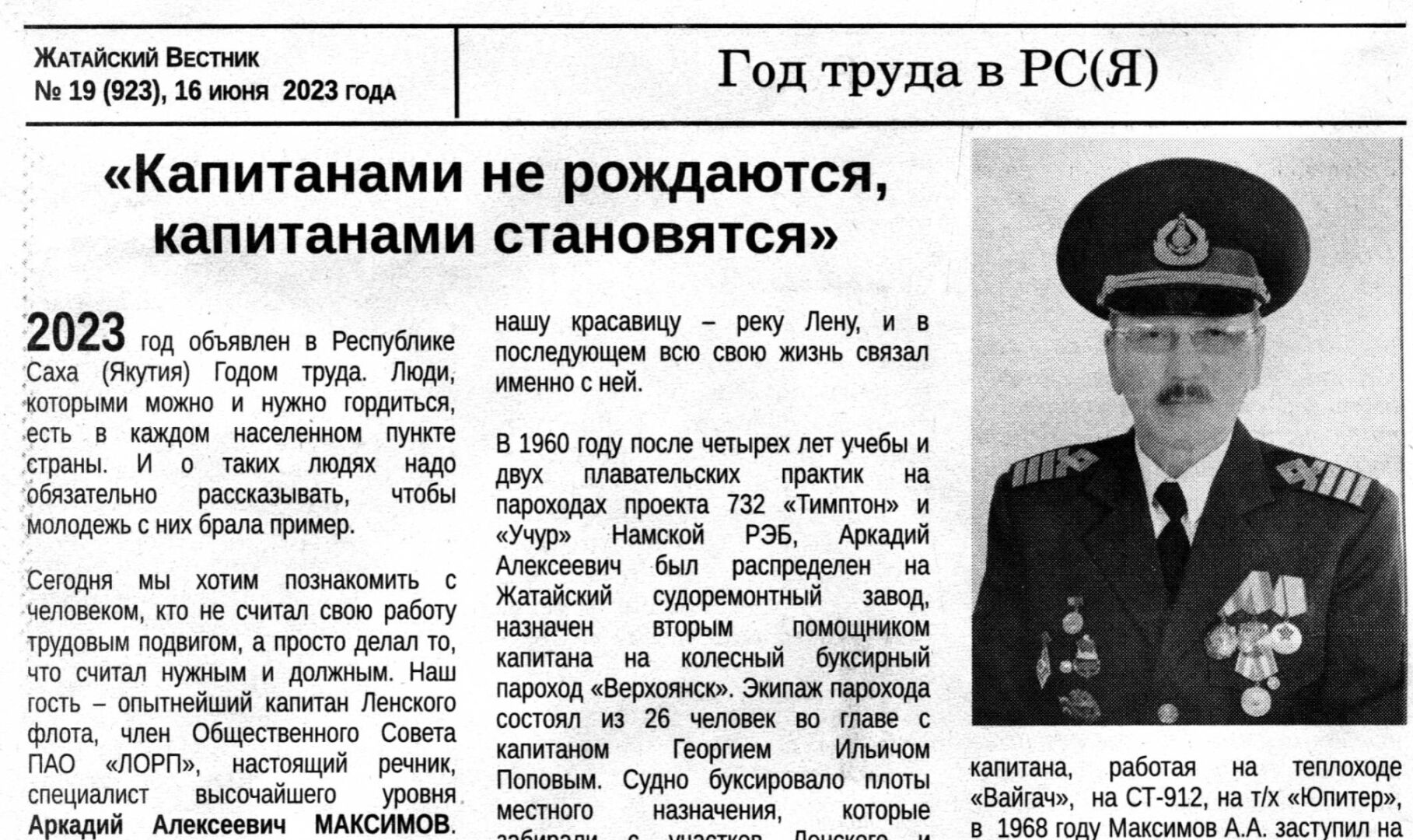 2023 год объявлен в Республике Саха (Якутия) Годом труда. Люди, которыми можно и нужно гордиться, есть в каждом населенном пункте страны. В газете «Жатайский вестник» опубликована статья жатайского музея «Капитанами не рождаются, капитанами становятся». Герой статьи — опытнейший капитан Ленского флота, член Общественного Совета ПАО «ЛОРП», специалист высочайшего уровня Аркадий Алексеевич МАКСИМОВ.