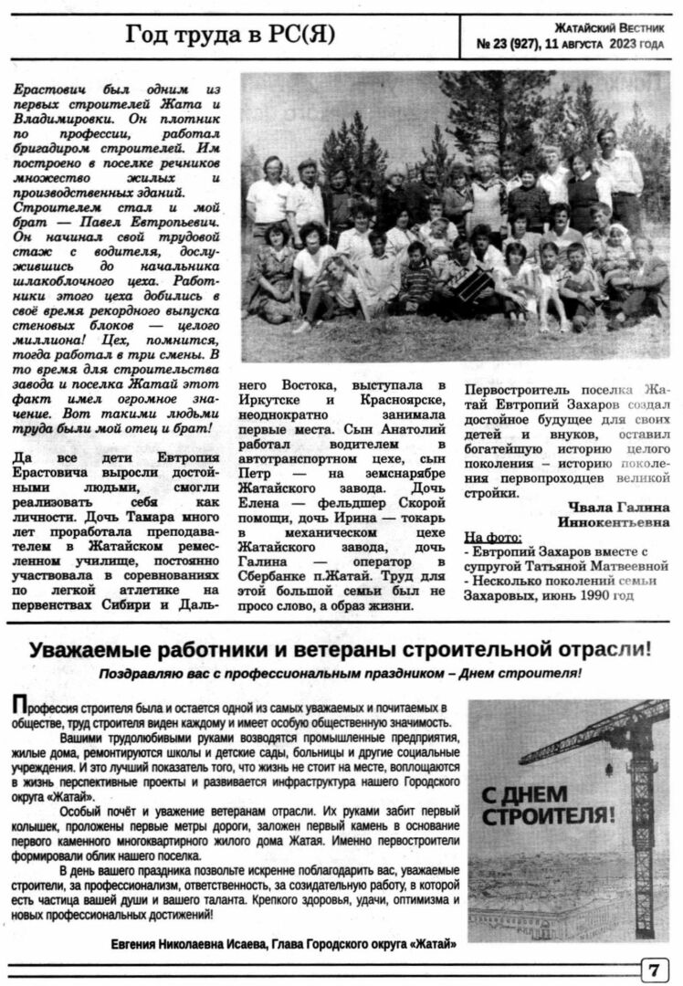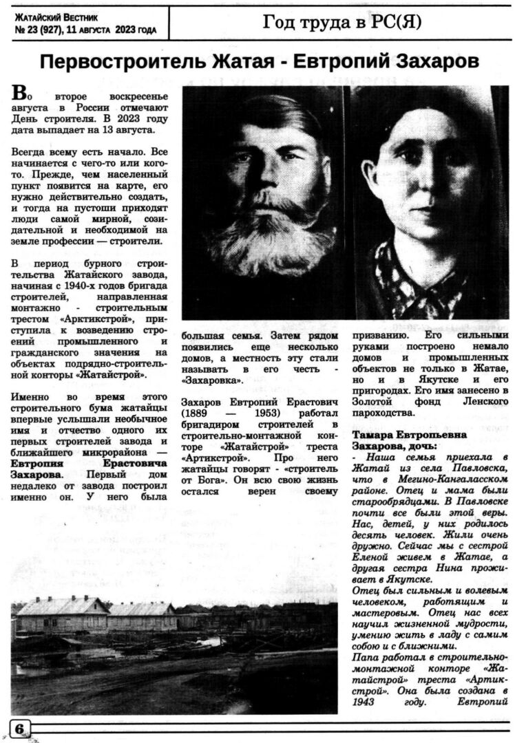 Продолжение цикла статей в газете «Жатайский вестник» в честь Года труда в республике. Сегодня речь пойдет об одном из самых известных строителей Жатая.